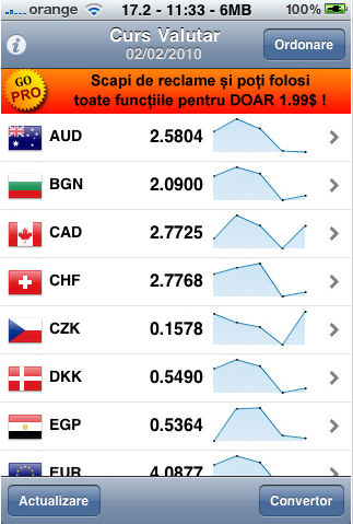 Versiunea free a roValuta va ofera doar acces la meniul principal si nimic mai mult, pentru accesul la celalate facilitati trebuie sa cumparati varianta Pro care costa 1.59€. Deocamdata aplicatia este numarul 1 in Top Free apps pentru AppStore Romania deci merita incercata macar daca aveti nevoie de asemeanea informatii zilnic.