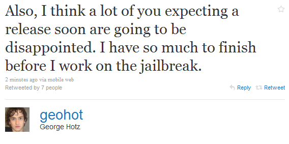 Totodata geohot le-a spus celor care ii cereau in privat copii ale noii sale solutii ca nu le va da absolut nimic. Un lucru interesant este faptul ca anumiti oameni l-au sunat pe geohot pentru a-i cere sa scoata o solutie de jailbreak, sau cel putin asa am dedus eu din ce a scris el acolo. Daca e adevarat atunci disperarea unora nu are limite, mai ramane sa-l rapeasca si sa-l puna sa faca jailbreak-ul de fata cu ei.