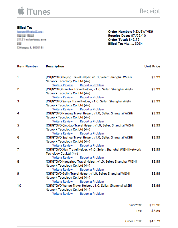 Ars reader Harper Reed contacted us to detail the problem. His account was used earlier today to purchase 34 of WiiSHii Network’s apps without his permission, for a total of $168.89. The apps appear to mostly be travel guides for cities in China, and come in both English and Chinese versionsoddly enough, Reed ostensibly bought both.
