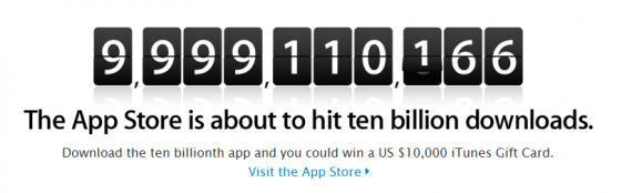 Dupa cum vedeti, au mai ramas mai putin de 1 milion de descarcari pana cand un norocos va descarca aplicatia cu numarul 10 miliarde de la Apple si va castiga un iTunes Gift Card in valoare de 10.000$. La aproximativ 20.000 aplicatii descarcate si doar cateva sute de mii de descarcari ramanse, pana la ora 13:00 cinev va fi ales castigator si Apple va stabili un nou record in ceea ce priveste descarcarile de aplicatii din AppStore.