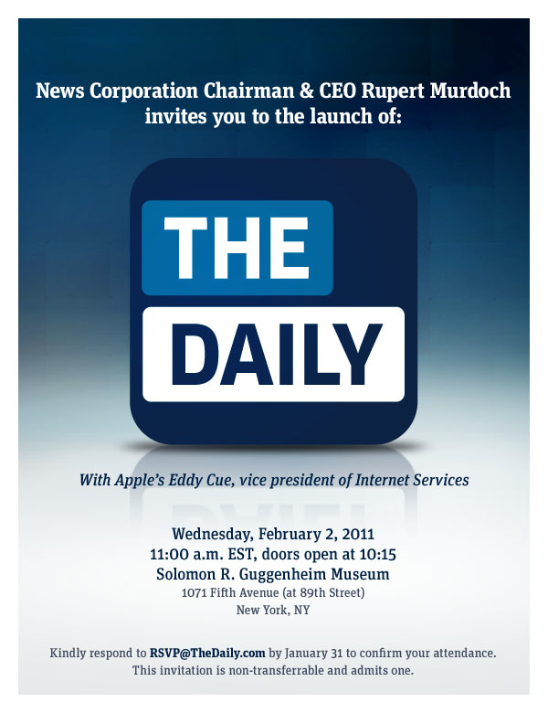 E oficial, pe 2 februarie Apple si News Corp vor tine o conferinta la New York pentru lansarea noii publicatii The Daily destinata tabletei iPad. Apple va introduce un nou sistem de abonari prin iTunes si este posibil ca acest nou sistem sa fie implementat prin iOS 4.3 care ar putea fi lansat in aceeasi zi. Pe 3 februarie Verizon va lansa iPhone 4 CDMA in reteaua proprie insa deocamdata nu se stie ce versiune a iOS vor avea aceste dispozitive. Terminalele disponibile la conferinta pentru prezentarea iPhone 4 CDMA aveau iOS 4.2.5 instalat si este posibil ca pe 3 februarie Apple sa lanseze iOS 4.2.5 numai pentru aceste terminale urmand ca iOS 4.3 pentru toate dispozitivele sa apara undeva mai tarziu.