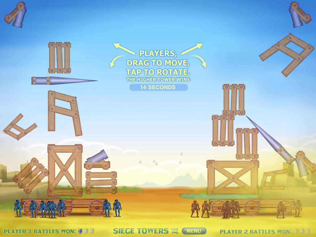 Descriere: Step into the medieval battle and build the higher Siege Tower to take over the enemy castle! In this fast and fun game made for two players sharing an iPad, your task sounds simple: drag the wood, spikes and cannons onto your wheeled base platform so tha…