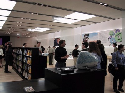 In luna mai a anului 2001 Apple deschidea primul magazin in Tysons Corner Center din Virginia. Steve Jobs era imbracat exact precum il stiti, cu aceeasi bluza cu guler si pantaloni de blugi, iar im imaginea de mai sus ii explica jurnalistului Walt Mossberg intregul concept din spatele design-ului magazinului. Acesta avea sa fie primul dintr-un sir de cateva sute de magazine pe care Apple le-a deschis in acesti ultimi ani insa anul acesta compania va mai deschide destul de multe magazine atat in SUA cat si in restul lumii. Design-ul interior al magazinelor a fost modificat pe parcurs si modul in care angajatii interactioneaza cu clientii a evoluat insa cel mai important, magazinele Apple au ajuns sa fie un punct de atractie pentru turisti si nu numai.