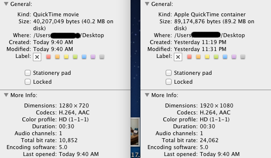 Camera noului iPhone 4S a fost laudata in diverse ocazii de catre cei care au apucat sa achizitioneze noul terminal si din moment ce am reusit sa cumpar si eu unul m-am gandit sa faca o mica, comparatie intre calitatea filmelor si a pozelor inregistrate cu terminalele noastre. Un articol despre asta voi scrie mai tarziu insa acum voi vorbi despre spatiul ocupat de filmele inregistrate de iDevice-urile noastre. In imaginea de mai sus am afisat informatiile pentru doua clipuri video inregistrate cu iPhone 4(stanga) si iPhone 4S in dreapta iar daca va uitati la dimensiunile acestora veti observa ca dimensiunea clipului inregisrat cu iPhone 4S este cu 125% mai mare decat cea a clipului inregistrat cu iPhone 4.
