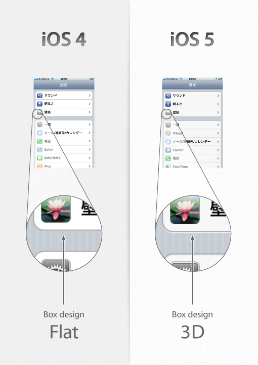 Noul iOS 5 al companiei Apple aduce destul de multe noutati fata de vechiul iOS 4 si modificarile nu se rezuma doar la iCloud, Notifications Center ori camera ci si la interfata sistemului de operare. In imaginile acestui articol avem exemplificate modificarile implementate de catre Apple pentru UI-ul iOS 5 si multe dintre ele sunt extrem de subtile. Spre exemplu in imaginea de mai sus ni se demonstreaza ca pentru badge-ul aplicatiilor a fost schimbata umbra care acum este gri si nu neagra.