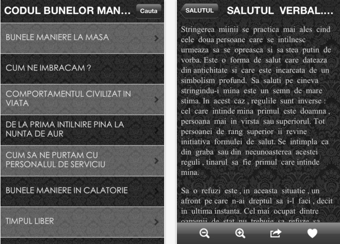 Pentru cei dintre voi care nu stiu cum sa se comporte atunci cand se afla in prezenta altor persoane exista acum o aplicatie in App Store care sa va ajute. Codul Bunelor maniere se numeste aplicatia si in ea veti gasi detaliate informatii despre modul in care ar trebui sa ne comportam in societate. Aplicatia costa 0.79€, nu aduce informatii noi si poate fi instalata pe iPhone, iPod Touch sau tableta iPad.