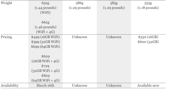 In aceasta seara Apple a prezentat noua tableta iPad si cei de la Engadget s-au grabit sa faca niste comparatii cu vechiul model al tabletei dar si cu alte modele de tablete Android disponibile pe piata. Mai jos le aveti listate pe toate si tableta iPad se evidentiaza prin ecranul Retina si procesorul grafic quad-core insa nu si prin alte specificatii.