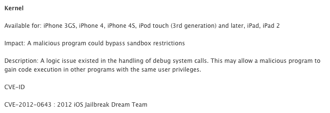 CVE-2012-0643 : 2012 iOS Jailbreak Dream Team