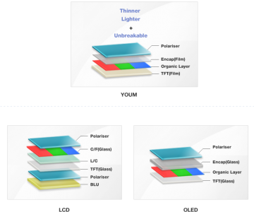 Samsung a anuntat inca de anul trecut ca va introduce pe piata ecranele flexibile pentru telefoane mobile si smartphone-uri iar acum va spun ca YOUM este denumirea ecranelor pe care compania coreeana intentioneaza sa le utilizeze in propriile produse. Denumirea este desigur ciudata insa importanta este tehnologia care sta la baza ei iar in imaginile de mai sus aveti explicat ideea din spatele producerii acestui tip de ecrane si componenta sa in comparatie cu deja clasicele ecrane LCD sau chiar OLED.