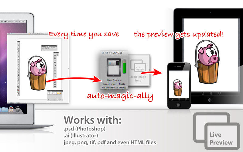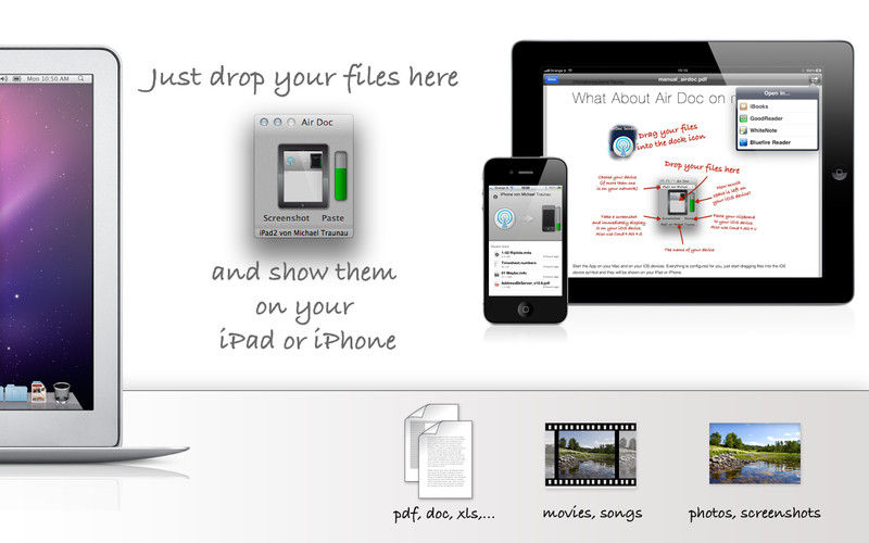 Descriere: Air Doc is the ultimate solution for transferring documents, movies, songs, etc to your iPad/iPhone. Simply drag & drop your files into the Air Doc App and they will open up immediately on your iPad or iPhone.