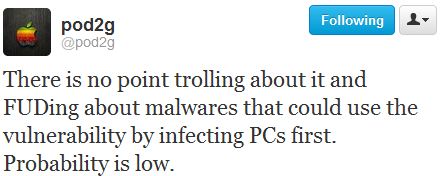 Impreuna cu acel avertisment Pod2G a lansat un altul prin care le recomanda utilizatorilor sa nu isi conecteze iDevice-urile la calculatoare pe care nu le-au mai folosit vreodata ori la unitati publice de reincarcare. Recomandarea vine din cauza ca vulnerabilitatea folosita pentru jailbreak ar putea fi utilizata pentru a infecta iDevice-urile cu malware. Desigur ca intai trebuie infectat calculatorul si prin acesta ar putea fi infectat iDevice-ul, insa trebuie sa aveti in vedere avertismentul lui Pod2G atunci cand va conectati terminalul la calculatoarele altor persoane. Pentru a va proteja de asemenea probleme puteti seta un cod de siguranta pe iDevice-ul vostru.