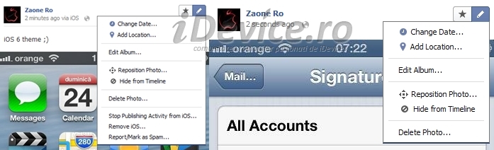 Cei de la Facebook nu au oferit detalii in legatura cu aceste optiuni, Apple nu a specificat absolut nimic, insa daca aveti iOS 6, incarcati o poza pe Facebook si accesati meniul de editare a post-ului atunci veti avea afisate optiunile din partea stanga a imaginii. Am facut o comparatie intre setul de optiuni disponibile pentru pozele incarcate direct din iOS(stanga) si cele incarcate prin aplicatia Facebook(dreapta) si observati ca in cazul celor incarcate prin iOS avem un set mai amplu de optiuni. Presupun ca in viitor Facebook va mai include altele si pana in toamna avem timp sa le descoperim.