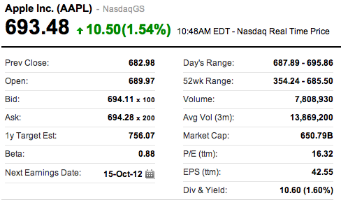 Miercuri Apple a anuntat iPhone 5, lumea intreaga a privit cu fara prea multa uimire dispozitivul, iar analistii par sa-l fi primit foarte bine, pretul actiunilor Apple crescand cu aproape 30$ in doar doua zile. Pe 12 septembrie, inaintea prezentarii iPhone 5, o actiune a Apple valora 669$, iar astazi valoarea a crescut pana la suma de 695.86$, aceasta fiind cea mai mare valoare inregistrata vreodata de o actiune a companiei. Multi spuneau ca iPhone 5 va „impinge” valoarea actiunilor Apple spre 700$, iar acest lucru pare pe deplin posibil in momentul de fata.