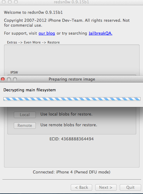 - dupa ce trec cele 10 secunde dati drumul butonului Power si telefonul ar trebui sa fie deja in DFU Mode, moment in care redsn0w 0.9 15 beta 1 va incepe sa implementeze exploit-ul pentru Pwned DFU.
