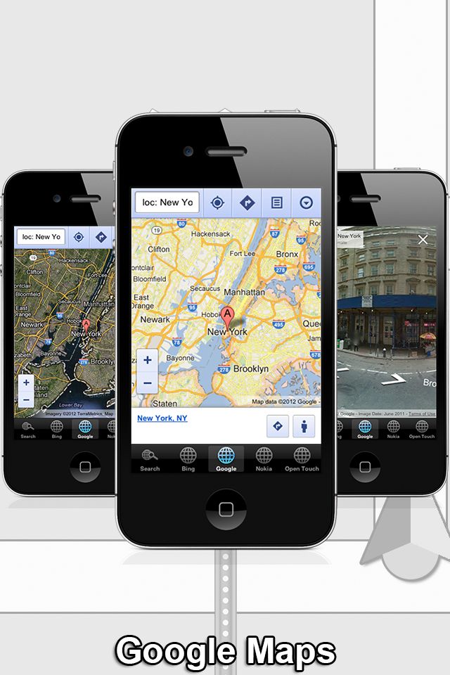 With this app you can compare Maps from Bing, Google, Nokia and OpenTouchMap. This app allows you to switch between the 4 different mapping providers, using their online web apps.* Bing Maps is the mapping solution from Microsoft. In previous incarnations it has been known as MultiMap and MapPoint. Views include Bird’s Eye and Aerial. Google Maps is the mapping solution from Google. Satellite, Traffic and Bicycling Views are available. The famous „Street View” is also available after you search for a location.^ Nokia Maps uses NAVTEQ mapping data. Views include Satellite View, Public transport view and Live traffic view. OpenTouchMap is based upon OpenStreetMap, a community supported mapping implementation.