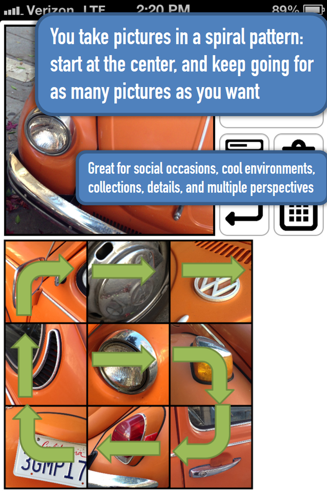 Descriere: GridPic allows you to take multiple pictures that form a grid, in the easiest way: simply start shooting, and GridPic keeps expanding the grid (in a spiral fashion), allowing any size grids like 22, 23, 33…