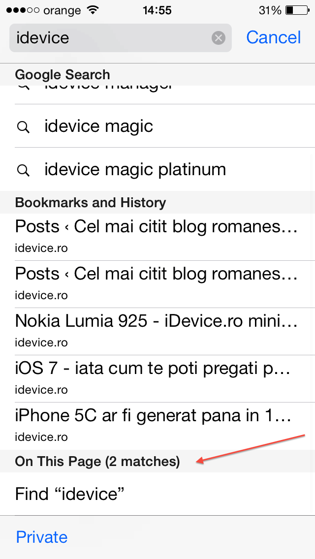 Dupa lansarea iOS 7 cu al sau nou Safari, am primit multe intrebari legate de posibilitatea de a efectua cautari in interiorul paginilor web deschise folosind noua versiune a browserului Safari. Avand in vedere ca in iOS 7 Safari are un unified search bar, acum veti vedea o singura bara de adresa in care puteti introduce adresa unui website, dar si un cuvant/grup de cuvinte pentru o cautare pe Google/Bing/Yahoo. Ei bine in aceeasi bara puteti introduce si cuvintele pe care doriti sa le cautati in interiorul paginilor, iar pentru a vedea rezultatele trebuie, eventual, sa faceti un scroll in jos printre rezultatele afisate deja, iar in partea inferioara a paginii veti vedea un tab numit On This Page (x matches).