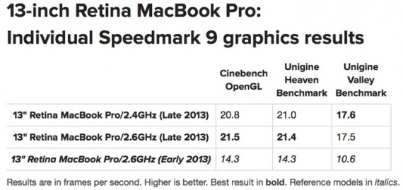 In noile MacBook Pro Retina Display 2013 compania Apple a ales sa implementeze un chipset grafic integrat Intel Iris, iar conform unor teste facute recent, el imbunatateste cu pana la 50% performantele grafice ale produselor. Dupa cum puteti vedea si in prima imagine a acestui articol testate versiunile entry-level si high-end ale MacBook Pro Retina Display 2013 13 inch, dar si modelul lansat la inceputul anului trecut, acesta functionand in baza arhitecturii Ivy Bridge, avand un chipse grafic integrat Intel HD 4000. Diferenta in performante este foarte mare, insa din pacate acest lucru nu se va simti chiar atat de tare in jocuri sau pe oriunde altundeva, chipset-ul in sine fiind slab in comparatie cu cele dedicate ale Nvidia sau AMD.