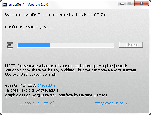 Cu doar cateva minute in urma evasi0n7 a fost lansat de catre echipa Evad3rs, aceasta fiind prima solutie de untethered jailbreak pentru iOS 7 publicata pentru utilizatori. Software-ul disponibil pentru sistemele de operare Windows si OS X ne permite sa facem untethered jailbreak oricaror iPhone, iPad si iPod Touch-uri car epot rula iOS 7, el fiind compatibil inclusiv cu versiunile beta ale iOS. Din pacate evasi0n7 nu face hacktivare, asa ca nu veti putea activa un iPhone codat pe o retea straina si nu veti putea activa un iPhone/iPod Touch/iPad care are Activation Lock activ.