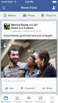 Facebook, aplicatia dezvoltata de catre compania cu acelasi nume pentru reteaua cea mai populara retea de socializare existenta in momentul de fata pe glob. Dupa anuntarea lansarii sistemului Nearby Friends, cei de la Facebook si-au actualizat aplicatia prezenta in App Store, insa nu au implementat aceasta noua functie, oferind totusi posibilitatea de a raspunde direct comentariilor publicate pe pagini sau post-uri care permit acest lucru, cea de-a doua noutate permitand administratirolor de grupuri sa revizuiasca si a aprobe post-urile aflate la moderare.