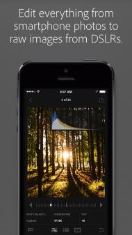 Edit and organize images anywhere, anytime on your iPhone. Enhance everything from smartphone photos to raw images from DLSRs using powerful and familiar tools. Automatically sync all your mobile edits with Lightroom 5 on your desktop. Easily share all your photos to social media sites. With Adobe Lightroom mobile, your photography is going places.
