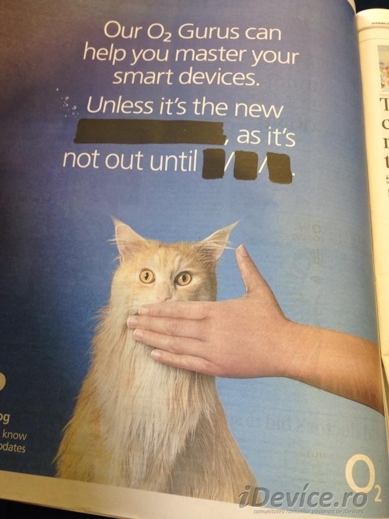 O2 este unul dintre marii operatori de telefonie mobila din Marea Britanie si in cursul acestor zile el promoveaza terminalul iPhone 6 prin intermediul ziarelor cu o reclame destul de interesanta. Fara a face referire directa la terminalul celor de la Apple, cei de la O2 anunta doar lansarea unui nou smartphone al carui nume si data de lansare nu pot fi dezvaluite, insa multumita celui care a descoperit reclama aflam despre ce terminal nou este vorba.