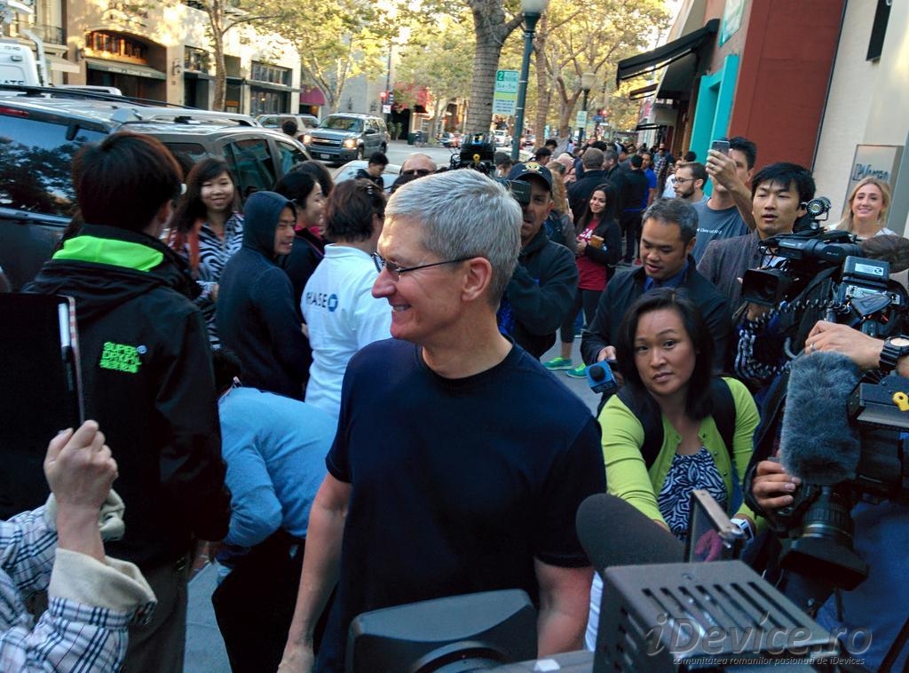 Tim Cook a stabilit o traditie in cadrul Apple, participand in fiecare an la lansarea iPhone-urilor noi la magazinul din Palo Alto, California. De aceasta data CEO-ul Apple a fost prezent singur in magazinul companiei pe care o conduce si desigur ca a generat isterie in randul celor prezenti pentru a cumpara iPhone 6 sau iPhone 6 Plus, Cook glumind cu acestia spunandu-le ca el detine unul dintre cele doua terminale inca de acum cateva luni de zile.