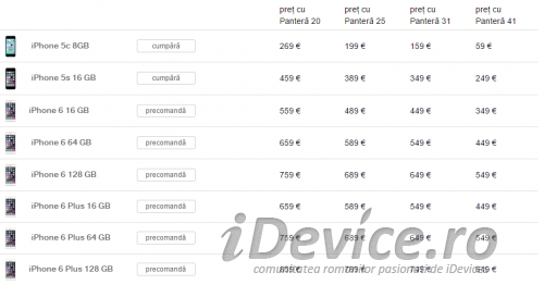 Pentru noile produse Apple, Orange România a ales patru abonamente speciale : Panteră 20, Panteră 25, Panteră 31 și Panteră 41, cel din urmă oferind cele mai bune prețuri pentru ambele produse ale companiei americane. Cel mai ieftin iPhone 6 16 GB costă 349€ la Orange cu un abonament Panteră 41, în timp ce cel mai scump iPhone 6 Plus 128 GB costa 649€ la același abonament, prețurile fiind mari pentru România și nu numai.