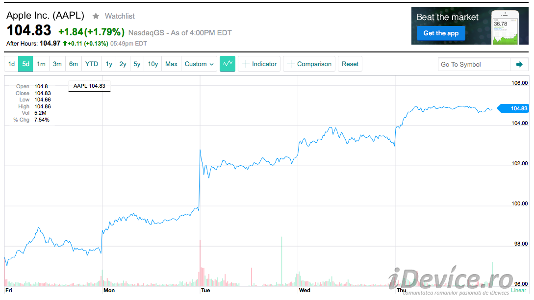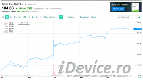 În cursul zilei de ieri prețul acțiunilor companiei Apple a atins valoarea de 104.83$ pe bursa americană, cel mai mare înregistrat în intreaga istorie a companiei din momentul listării sale la bursă și până în prezent. Valoarea maximă anterioară atinsă de către prețul acțiunilor companiei este de puțin peste 102$, iar rezultatele financiare recente și succesul iPhone 6 și iPhone 6 Plus au crescut încrederea investitorilor în compania Apple și produsele sale.