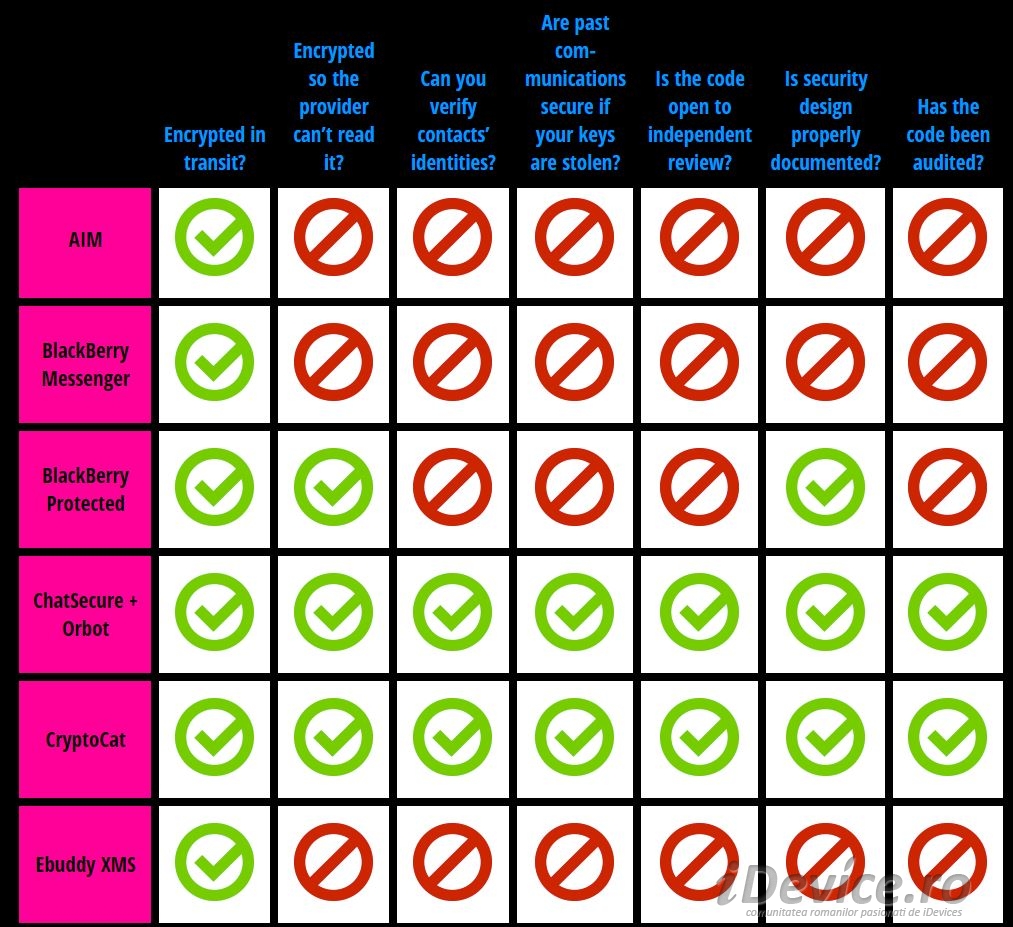 iMessage și FaceTime au generat mari bătăi de cap pentru agențiile federale americane care nu reușeau să intercepteze mesajele și pozele trimise de către infractori între iPhone-uri, dar nici conferințele video. Securitatea acestor două servicii a fost îndelung lăudată de către diverse companii specializate pe securitate, iar cei de la EFF, un ONG specializat pe protejarea drepturilor consumatorilor pe internet, a dorit să verifice securitatea tuturor aplicațiilor de mesagerie text, audio și video.