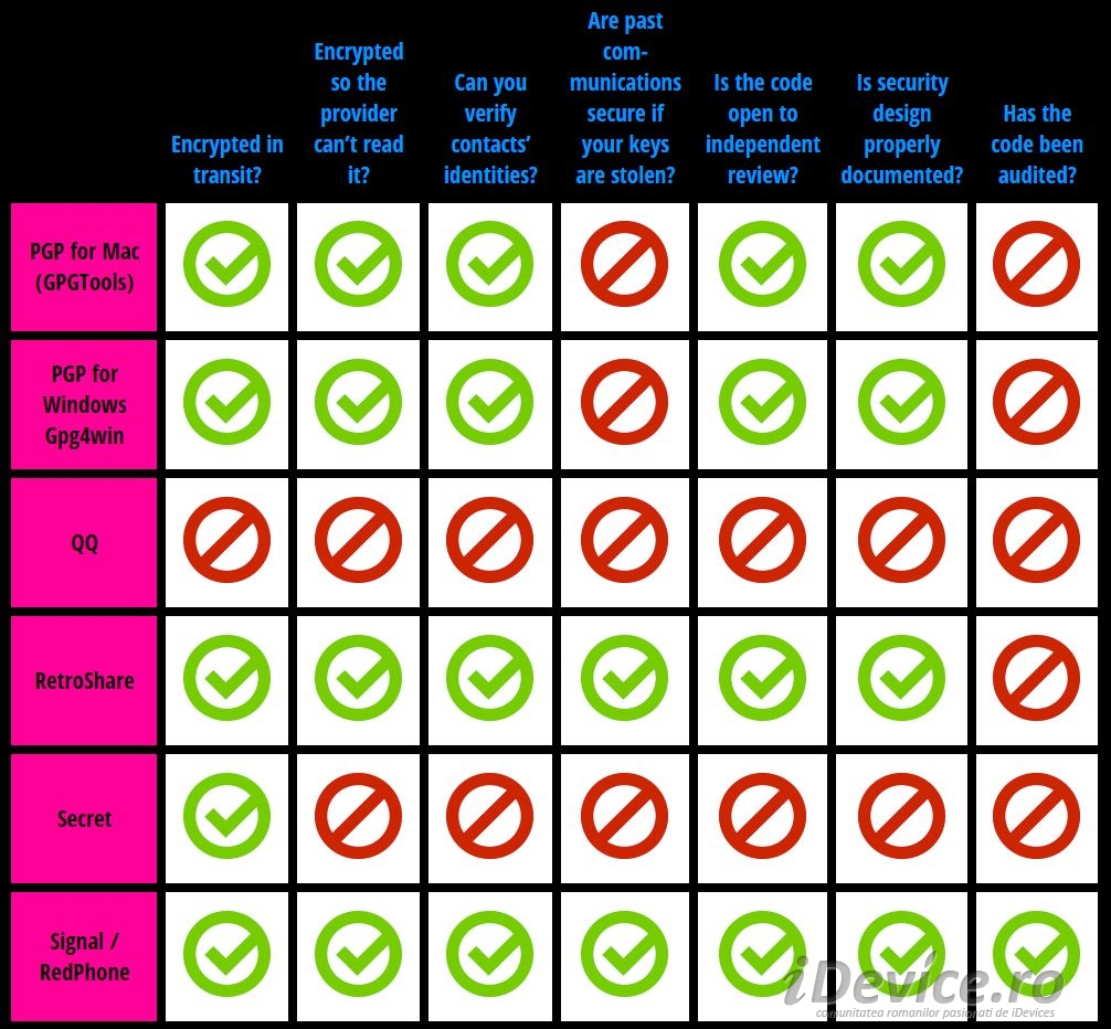 În imaginile acestui articol aveți rezultatele unor teste făcute pe 7 categorii, EFF dorind să afle care aplicații criptează datele în tranzit astfel încât nimeni să nu le poată citi, care permit identificarea contactelor, care securizează arhivele de conversații și care sunt corect documentate sau au audit făcut. Dintre toate aplicațiile verificate, doar TextSecure, Silent Text, Silent Phone, Signal, CryptoChat și ChatSecure oferă securitate totală pentru utilizatorii lor în orice condiții.