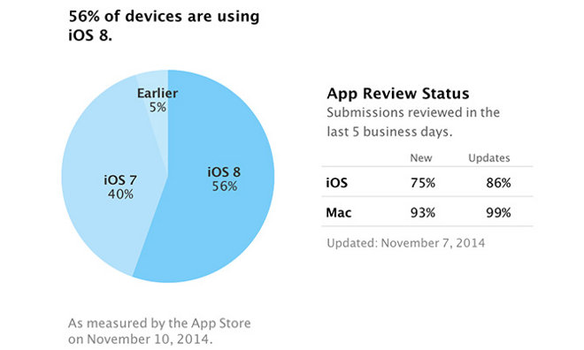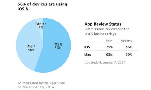 iOS 8 a fost lansat acum aproape două luni de zile pentru iPhone, iPad și iPod Touch, dar până acum numai 56% dintre terminalele companiei Apple au instalat noua versiune a sistemului de operare. Cifra este cu 4% mai mare decât cea înregistrată acum aproximativ trei săptămâni de zile, atunci doar 52% dintre iDevice-urile companiei Apple instalând efectiv actualizarea. În baza informațiilor furnizate de către compania Apple, se pare ca toți cei care au făcut trecerea la iOS 8 vin de la iOS 7, utilizatorii vechilor versiuni ale sistemului de operare neavând posibilitatea de a face update.