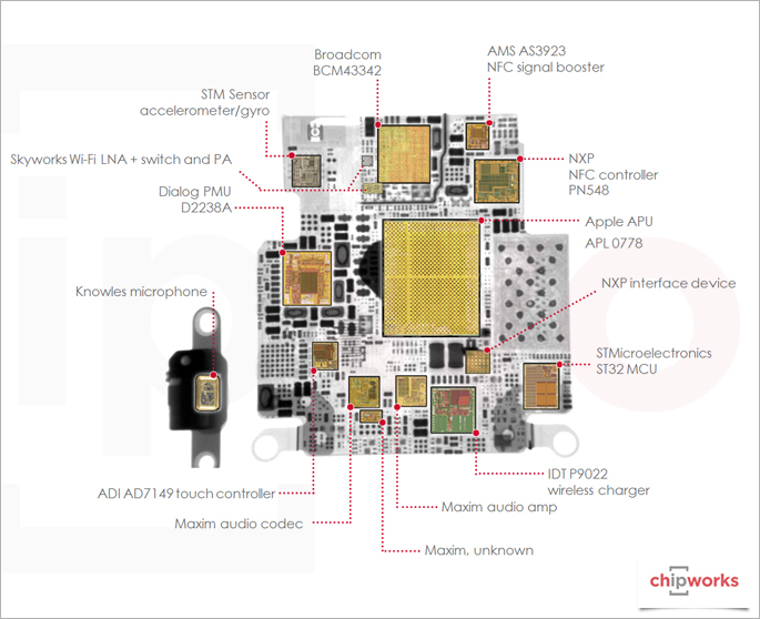 Apple and/or their suppliers have designed and manufactured a 26 mm x 28 mm package that is very unique. Let’s consider its construction for a moment. We have a common motherboard to which all of the components (wafer scale packages, PoPs, BGAs, etc.) have been attached. The entire motherboard, with all of its components, is then overmolded with a packaging compound containing silica or alumina spheres suspended in a resin. We see this same type of material in conventional IC packaging, but we have never observed this being used over a 26 mm x 28 mm motherboard.