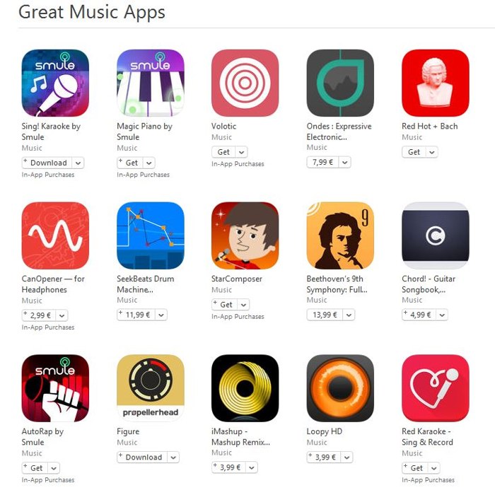 Dupa cum puteti vedea si din imaginea alaturata, vorbim despre aplicatii care fie ne permit sa ascultam muzica in propriile terminale, fie ne permit sa compunem muzica direct din iDevice-urile celor de la Apple. Partea interesanta este ca exista si aplicatii pentru karaoke, astfel ca daca sunteti fani ai acestui tip de distractie, puteti transforma iDevice-ul intr-o masina de karake, dar numai daca aveti si un microfon.