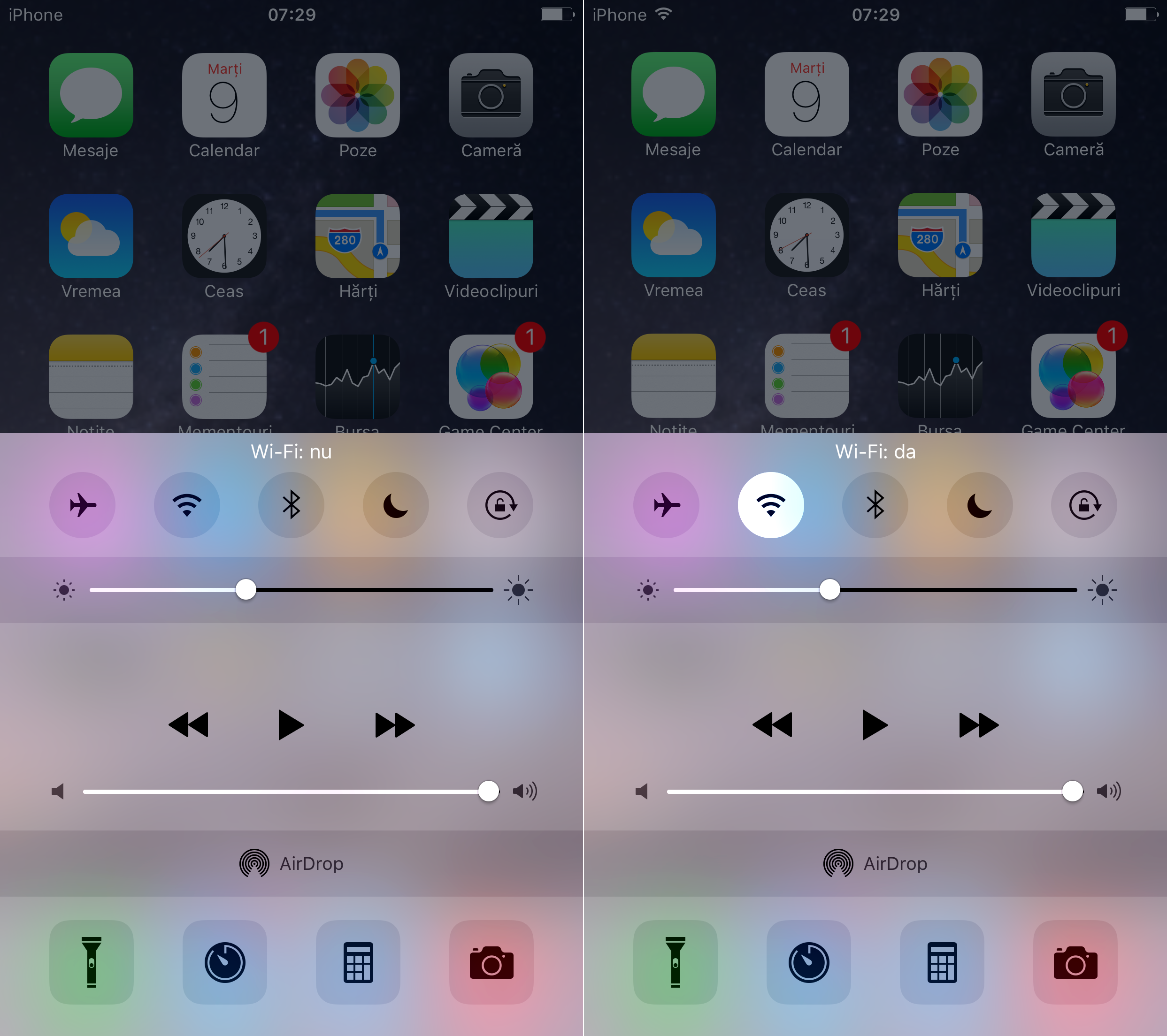In iOS 9 Centrul de Control confirma activarea sau dezactivarea de optiunilor disponibile in interfata sa, compania Apple considerand probabil ca utilizatorii nu inteleg exact ce fac acele functii, astfel ca acum le afiseaza in interfata Control Center exact ce optiuni aleg. Dupa cum puteti vedea din imaginile acestui articol, atunci cand actionam unul dintre toggle-urile vizibile in interfata Centrului de Control, un mesaj va fi afisat in partea superioara care ne spune daca am activat sau dezactivat o functie prin texte de genul : WiFi : da pentru activare sau WiFi : nu pentru dezactivare.