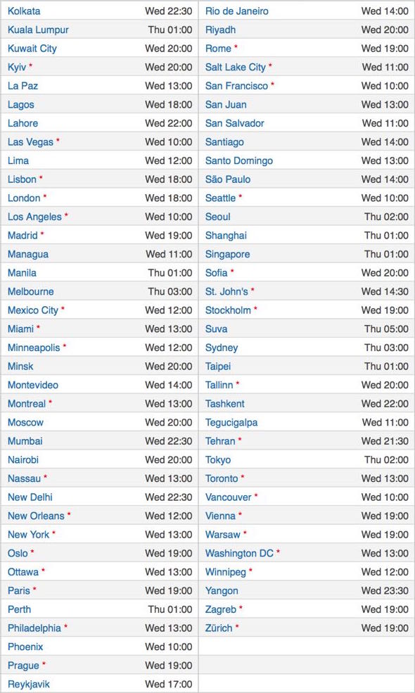 Lansarea iOS 9 va fi simultana in toate tarile de pe glob, astfel ca ora 20:00 in Romania va corespunde unei alte ore din Europa sau de pe alt continent, asa ca imaginea de mai jos are rolul de a va ajuta sa va orientati mai usor pentru a putea descarca actualizarea cand apare.
