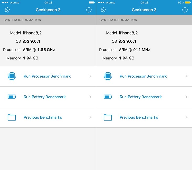 Mai exact, activarea Low Power Mode pe iPhone 6S si iPhone 6S Plus reduce frecventa procesorului de la 1.85 GHz la 911 MHz, adica o reduce la exact jumatate pentru a reduce implicit si consumul de energie pe care componentele interne in fac in timpul folosirii.