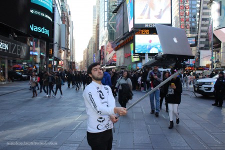 MacBook Selfie Stick este o creatie a unor artisti americani care s-au gandit ca este oportun sa demonstreze cat de stupida a devenit moda selfie-urilor si cat de deranjanta este uneori, mai ales in zonele in care exista multe obiective turistice pe care lumea le viziteaza.