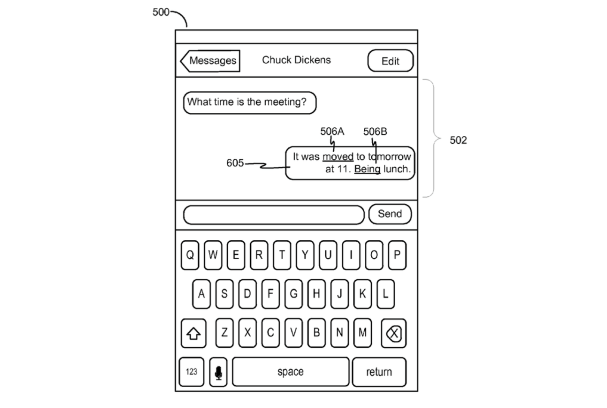Conform brevetului de inventie al companiei Apple, cuvintele corectate automat si introduse in mesajele trimise de catre noi vor avea o linie albastra sub ele pentru a le da de inteles interlocutorilor ca respectivul cuvant nu a fost scris de catre noi, ci introdus de sistem.