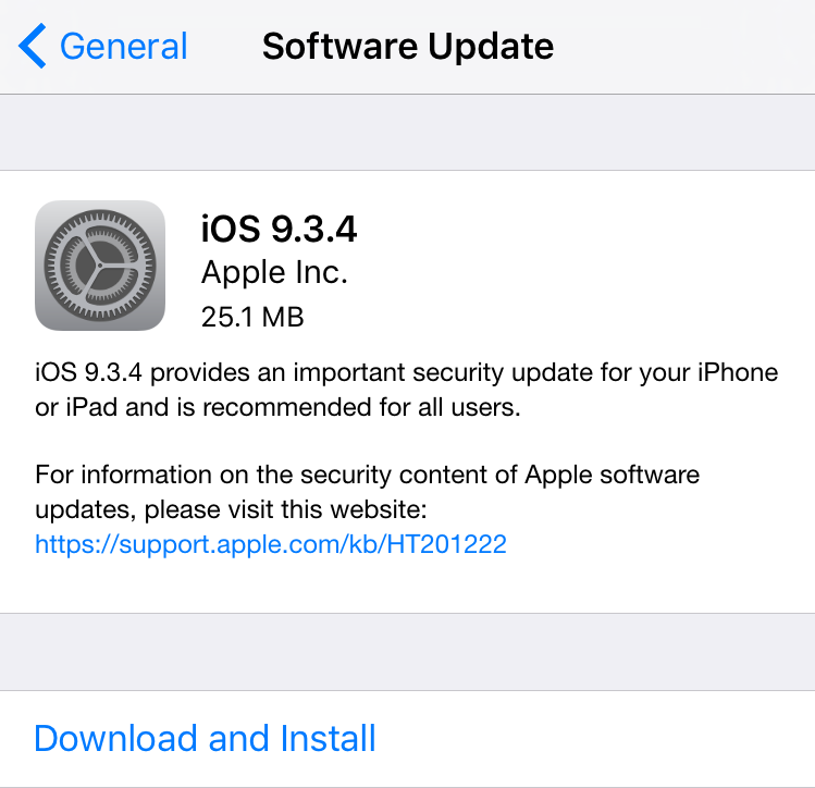In momentul de fata puteti instala iOS 9.3.4 prin intermediul sistemului Software Update, Actualizare Software, el fiind disponibil in meniul Settings > General > Software Update, Configurari > General > Actualizare Software, acolo existand si optiunile pentru a instala aceasta actualizare in terminale.