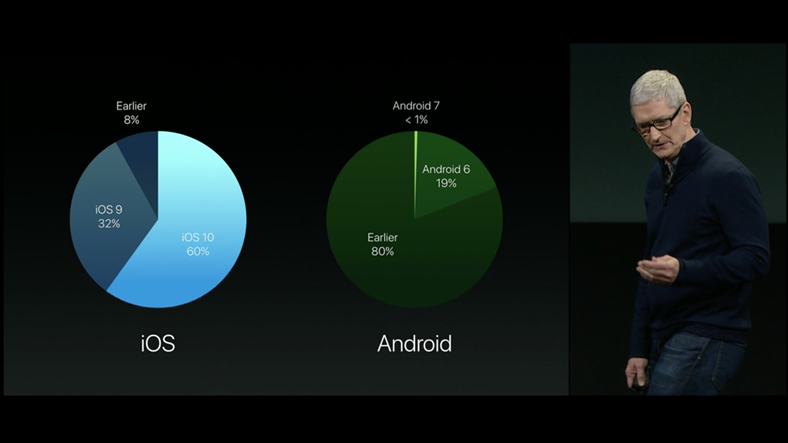 Rata de adoptie foarte mare inregistrata de catre iOS 10 a reprezentat un motiv foarte bun pentru Apple de a ironiza platforma Android a celor de la Google. Tim Cook a afirmat ca iOS 10 cu a sa rata de adoptie de 60% pune in umbra Android 7, care a fost instalat pe doar 1% dintre terminalele care sunt capabile sa il ruleze acum.