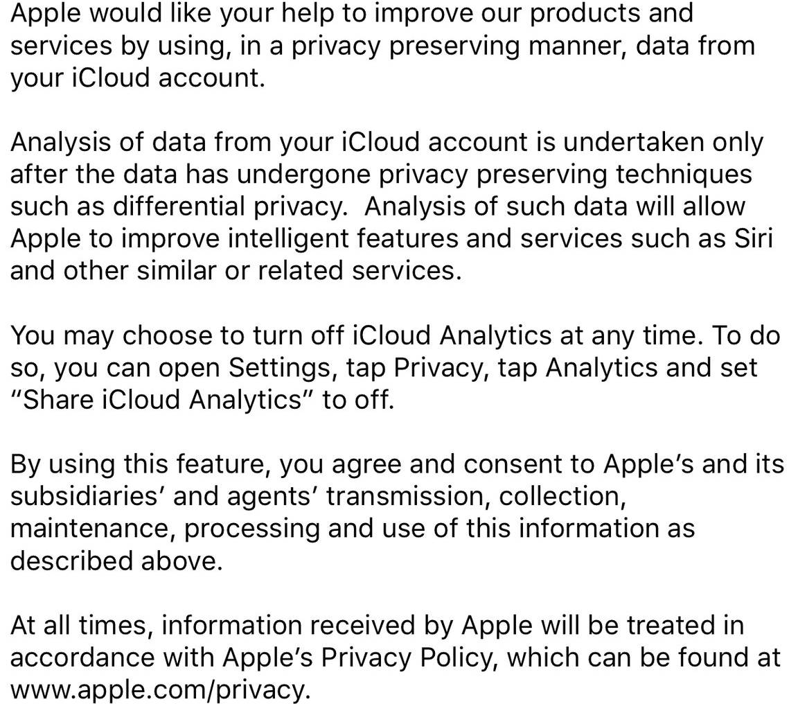 Datele preluate de catre compania Apple vor fi analizate in mod anonim si vor contribui la oferirea de functii diferentiate de intimitate pentru diversi utilizatori. Teoretic Apple nu va sti de la ce persoane vin aceste date, insa coroborand diverse moduri de a folosi iCloud, ar urma sa descopere o metoda de a ne oferi functii mai bune si care acopera mai bine nevoile noastre.
