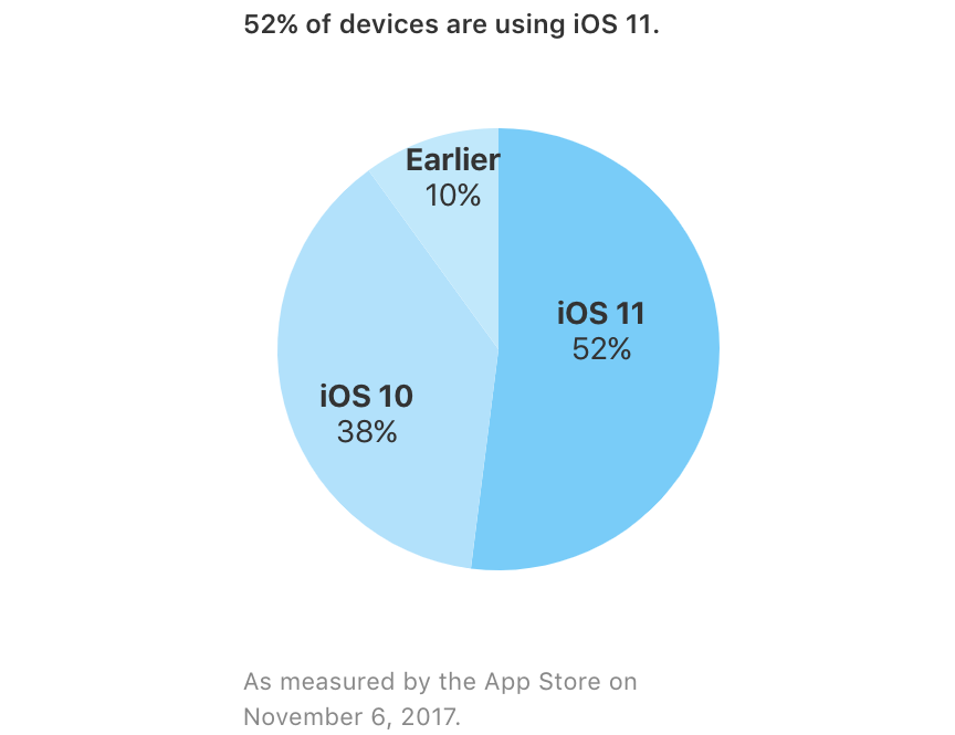 iOS 11 e instalat pe 52% dintre iDevice-uri, in timp ce iOS 10 ruleaza pe 38% dintre ele, iar restul de 10% ruleaza vechile versiuni ale sistemului de operare iOS al Apple. iOS 10, in aceeasi perioada a anului trecut, rula pe 60% dintre iDevice-urile companiei Apple, deci avem o diferenta mare intre ratele de adoptie ale celor doua versiuni ale iOS.