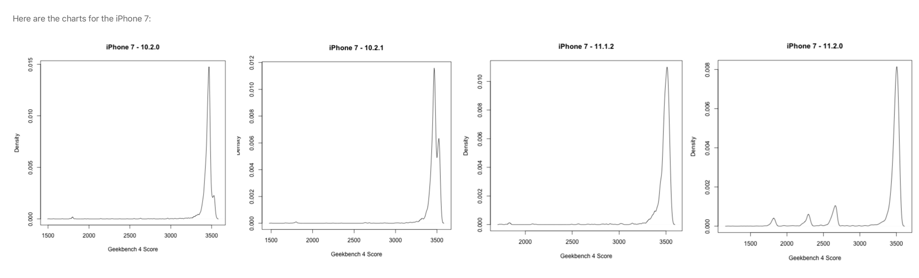 “To answer these questions I’ve plotted the kernel density of Geekbench 4 single-core scores for the iPhone 6s and the iPhone 7 running different versions of iOS. Scores obtained in low-power mode are not included in the distribution.”