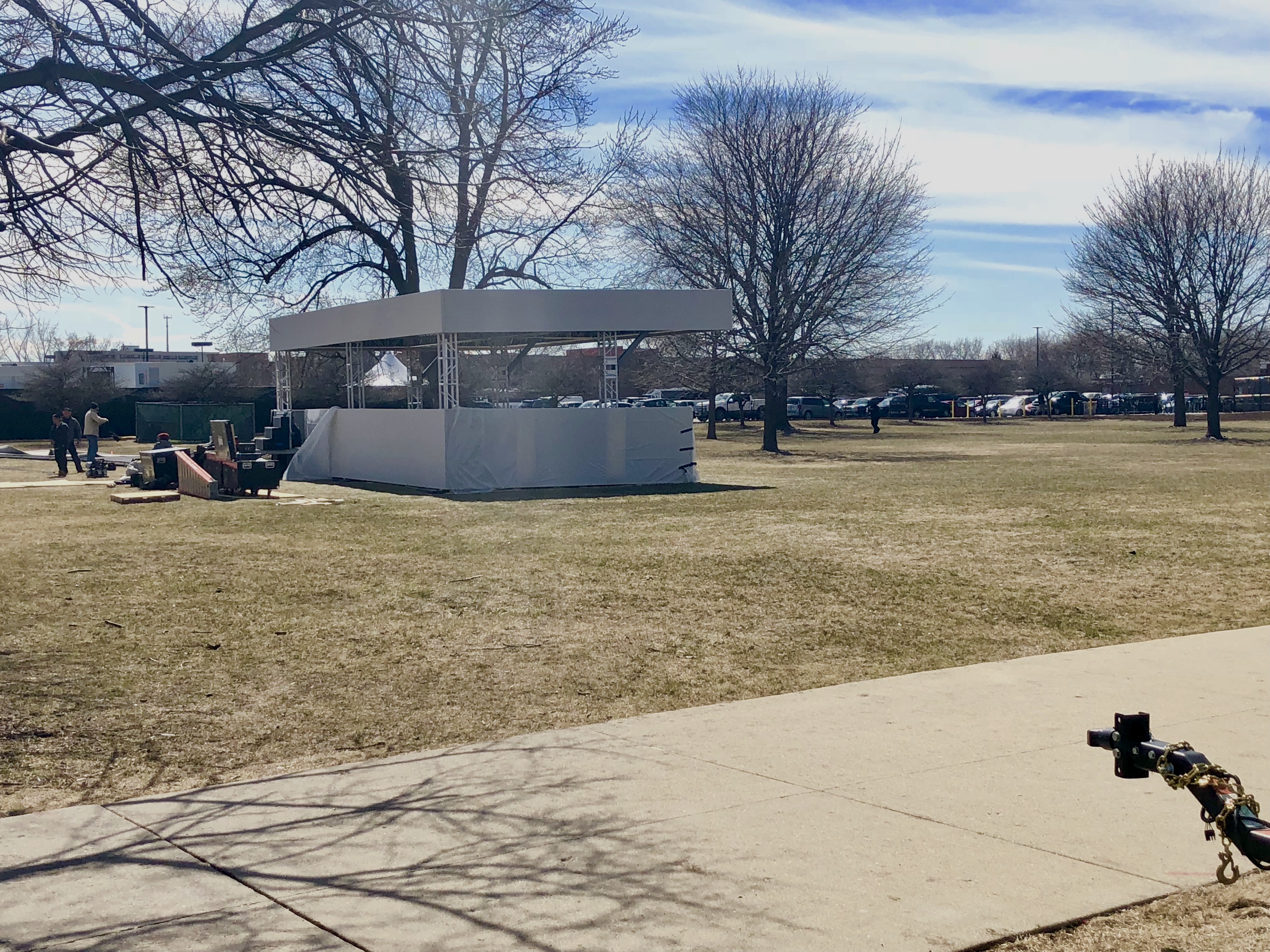 Apple a inceput in weekend sa amenajeze locatia evenimentului care urmeaza sa aiba loc in cursul zilei de maine, cei din Cupertino pregatind totul pentru presa invitata. Apple va sustine o coferinta de presa in cadrul liceului tehnic Lane din Chicago, acolo urmand a fi prezentate cateva produse nou, dar si software nou pentru mediul educational din SUA.