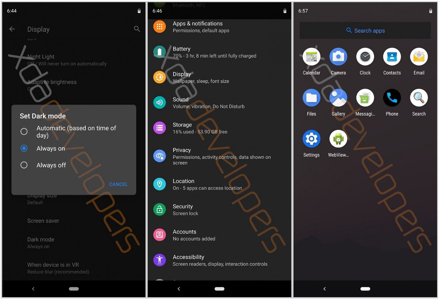 Android Q. Prima schimbare importanta descoperita este un dark mode care va fi disponibil pentru intreaga interfata a sistemului de operare, nu doar pentru anumite aplicatii, sau sectiuni din ele. Noul dark mode poate fi activat din sectiunea cu setari pentru ecran, iar dupa cum puteti vedea, toata interfata Android Q este modificata pentru a afisa o tema intunecata, aplicatiile native avand deasemenea parte de aceasta schimbare substantiala pregatita de catre Google.