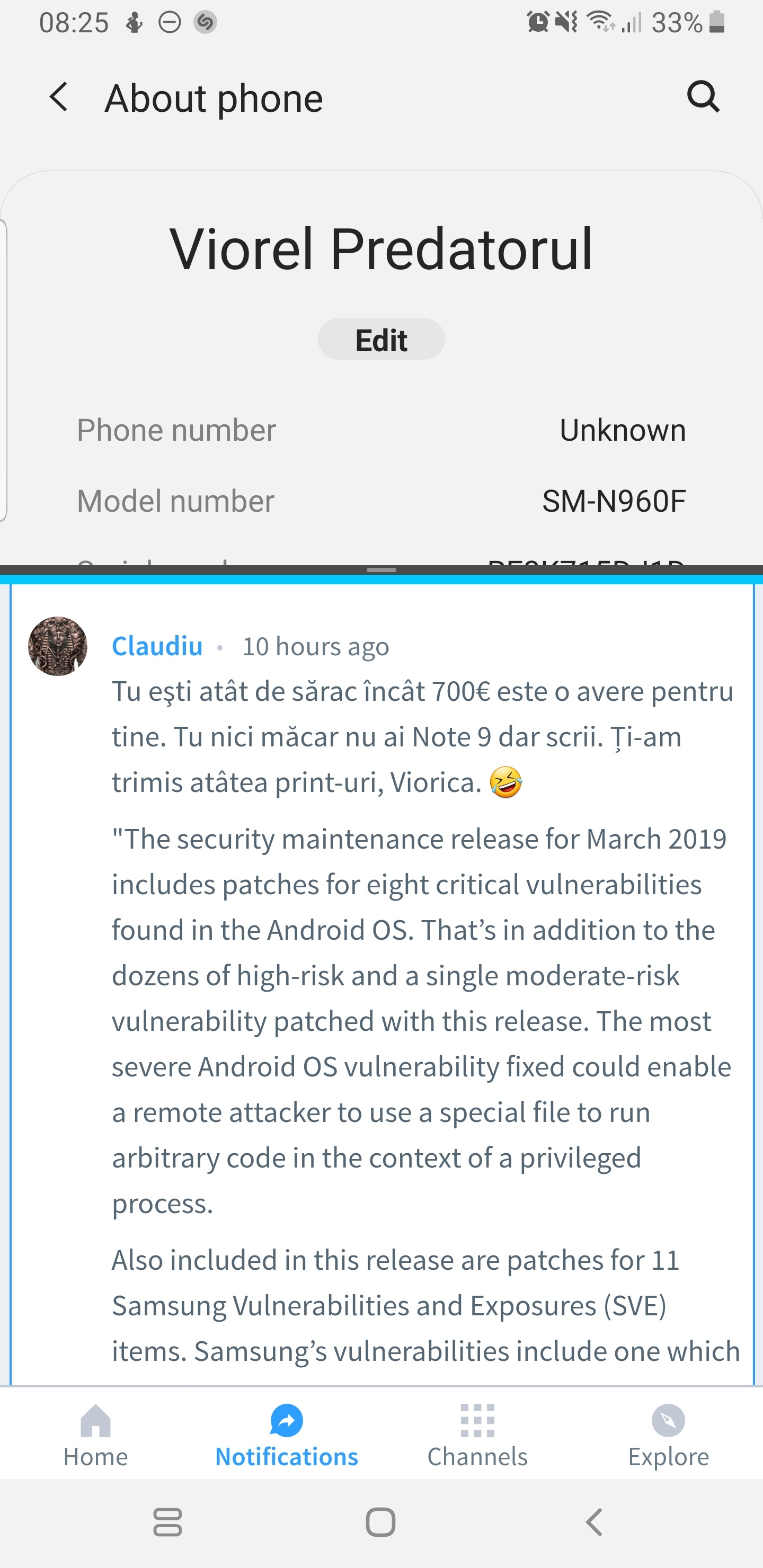 Eu, spre deosebire de tine, îți pot trimite oricând printscreen cu răspunsul tău. Tu mergi la magazin și faci un printscreen după care îl mâzgălești cu scrisuri de gherțoi ca să arăți că ai Note 9.