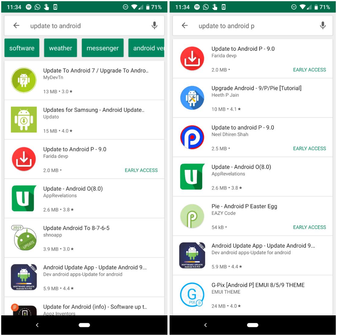 Android 9. Dezvoltatorii se folosesc si de functiile Google Play Store pentru a pacali mai usor utilizatorii, unele dintre aplicatii fiind marcate ca oferind „acces in premiera” la posibilitatea de update, inainte de a fi lansate in mod public. Totul face parte din tactica dezvoltatorilor de a ii pacali pe oamenii care cred ca aplicatiile acestea le pot aduce Android 9 in telefoane, insa care in realitate sunt tepe care exista doar pe platforma celor de la Google.
