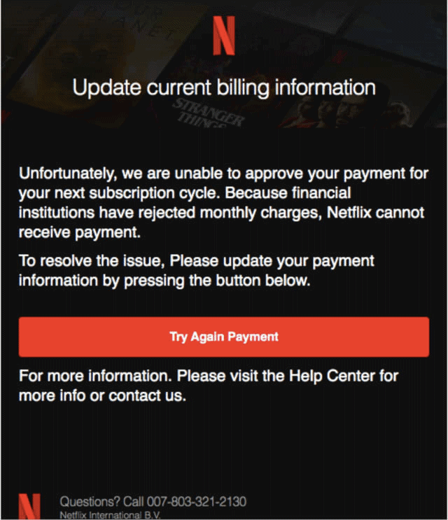 Netflix i-a mai avertizat in trecut pe utilizatorii sai in legatura cu aceasta problema, insa din pacate n-a avut vreun succes in a convinge pe toata lumea in legatura cu gravitatea situatiei, si riscurile la care oamenii se expun. In aceasta situatie, foarte multi dintre cei care primesc email-uri de acest gen nu prea stiu ce sa faca, si isi dau de foarte multe ori datele cardurilor catre hackeri, in loc de Netflix, fara sa isi dea seama ca sunt complet inselati.