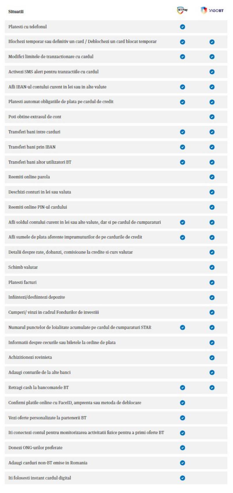 BANCA Transilvania spune ca BT Pay nu ofera posibilitatea de a primi SMS-uri la tranzactii cu cardul, de a scoate extrasuri de cont, de a reemite parola pentru cont, sau de a deschide un cont in LEI, sau valuta. Nici reemiterea PIN-ului cardului nu e posibila, sau plata de facturi, ori schimbul valutar, achizitionarea de roviniete fiind deasemenea ceva ce nu e posibil, dar nici adaugarea de conturi de la alte banci din Romania, desi se pot adauga carduri.